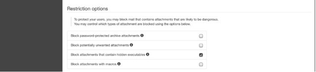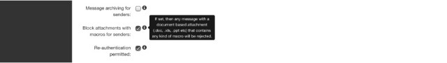 Macros: email messages containing attachments that have macros are a common source of dangerous content. We recommend that macros are disabled in Office for all users that do not require their use, and that sharing any documents that contain macros is done via a document control system, like SharePoint, Google Drive, iCloud, or DropBox. You can block all incoming messages containing macros with the setting on the “Filter settings” page:
